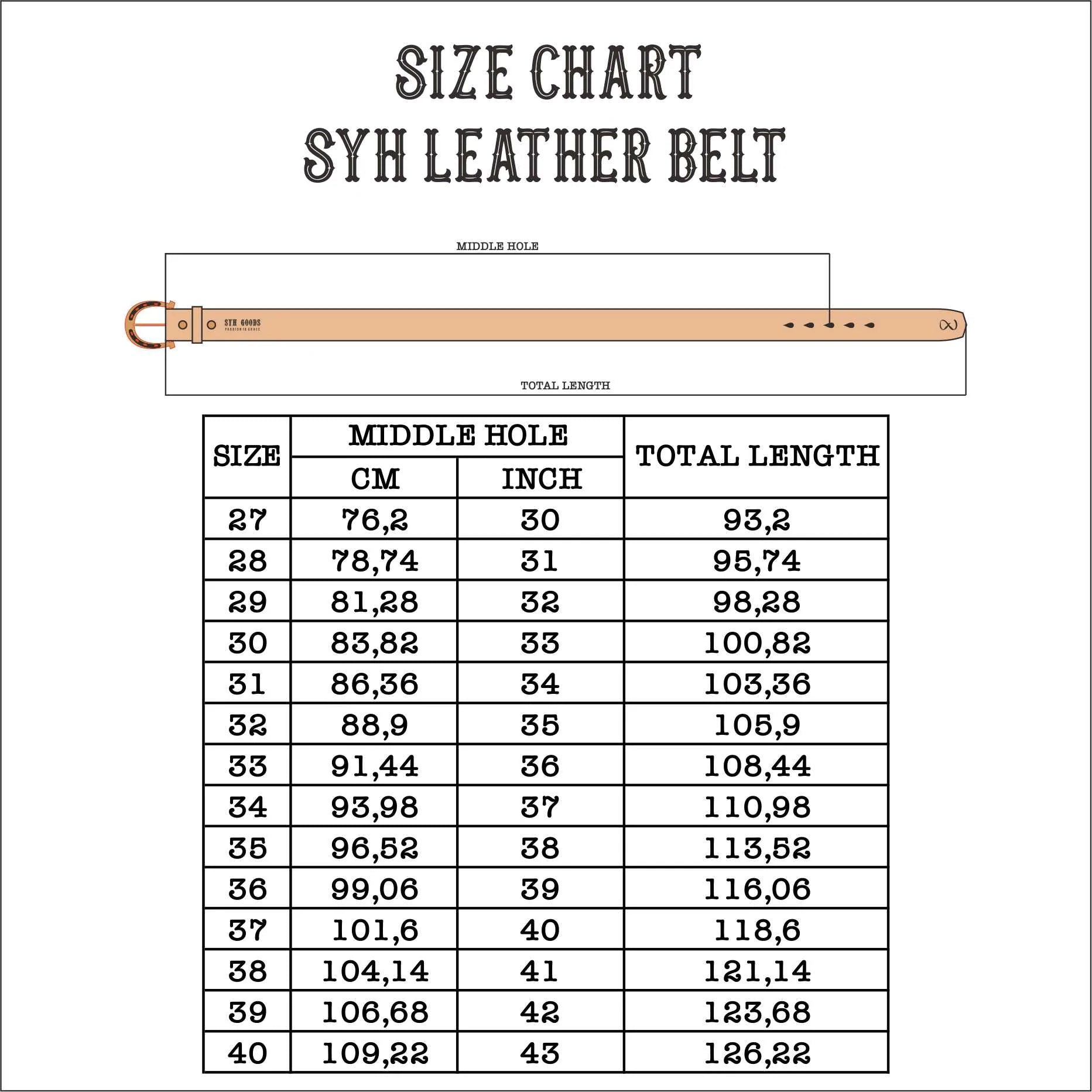 (veuillez mesurer une ceinture qui vous convient et la comparer avec les mesures ci-dessus. Si vous avez des questions, n'hésitez pas à nous contacter par e-mail : info@syhgoods.net)