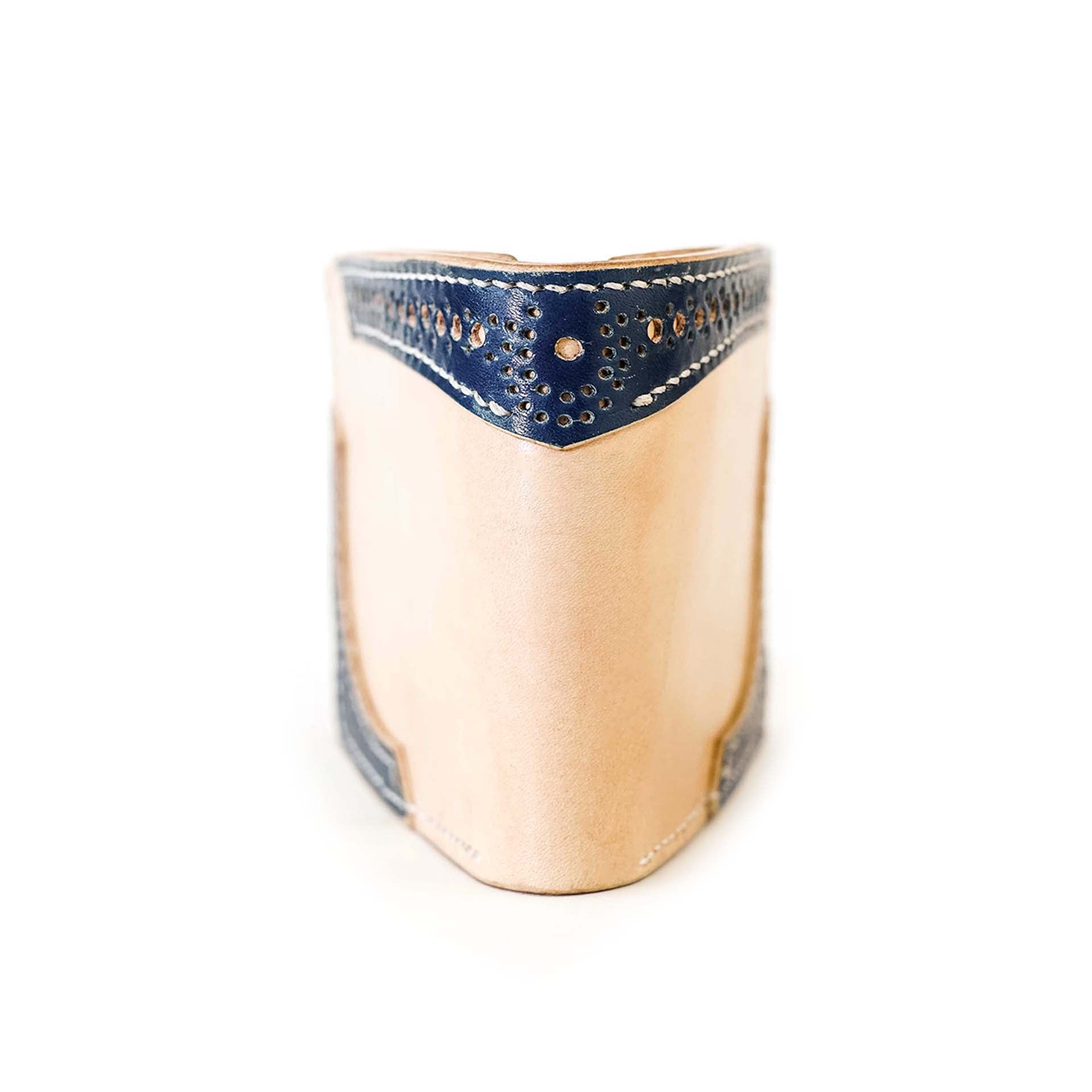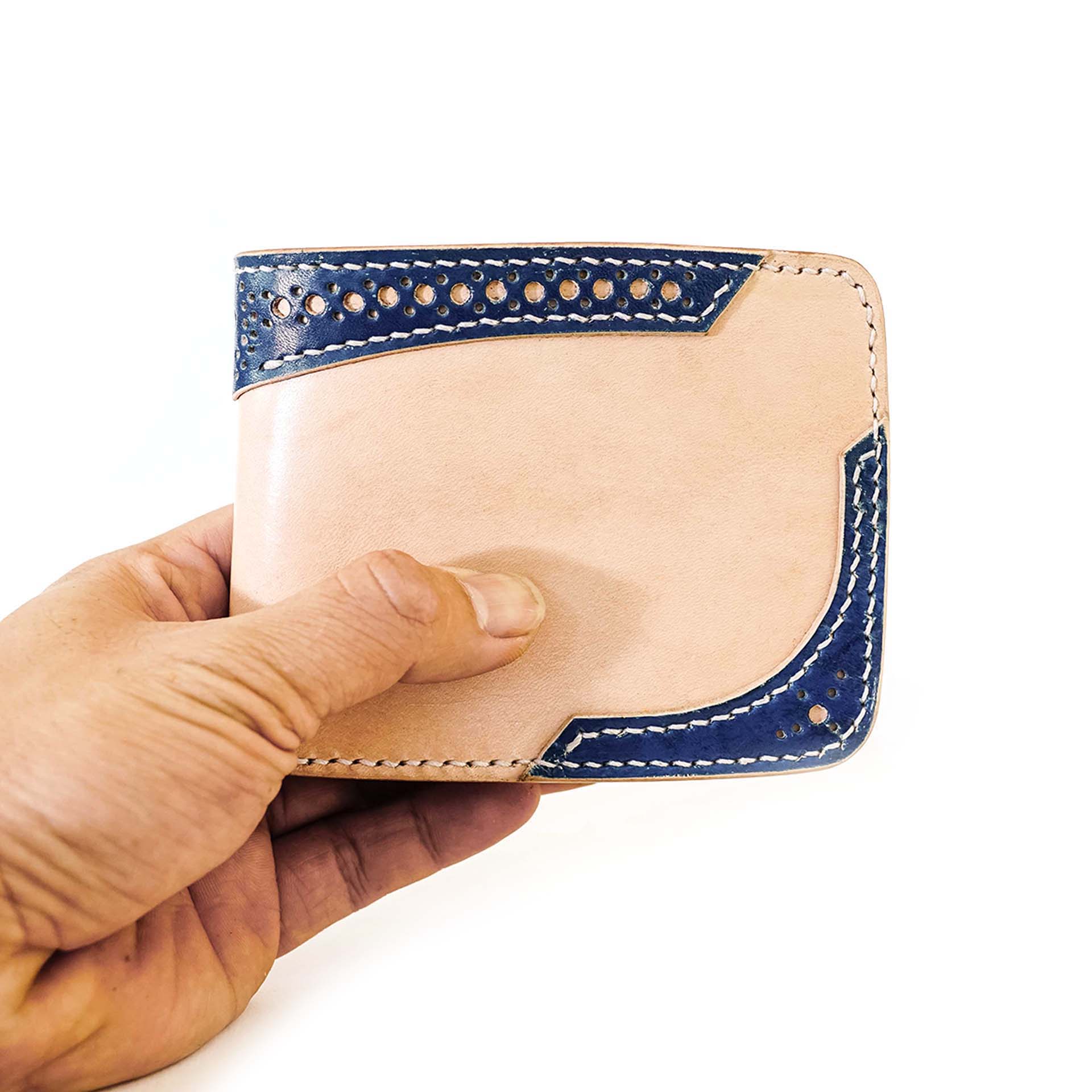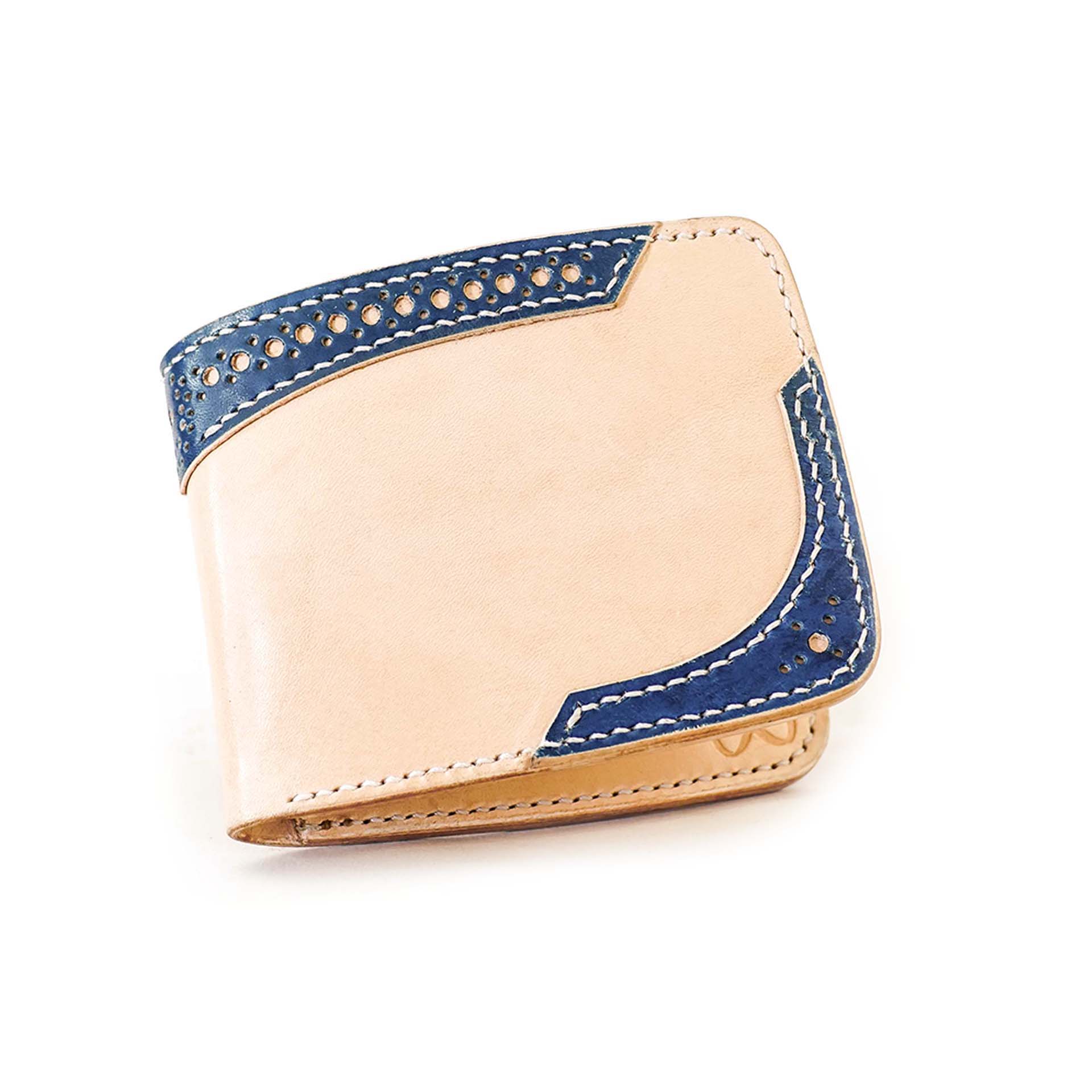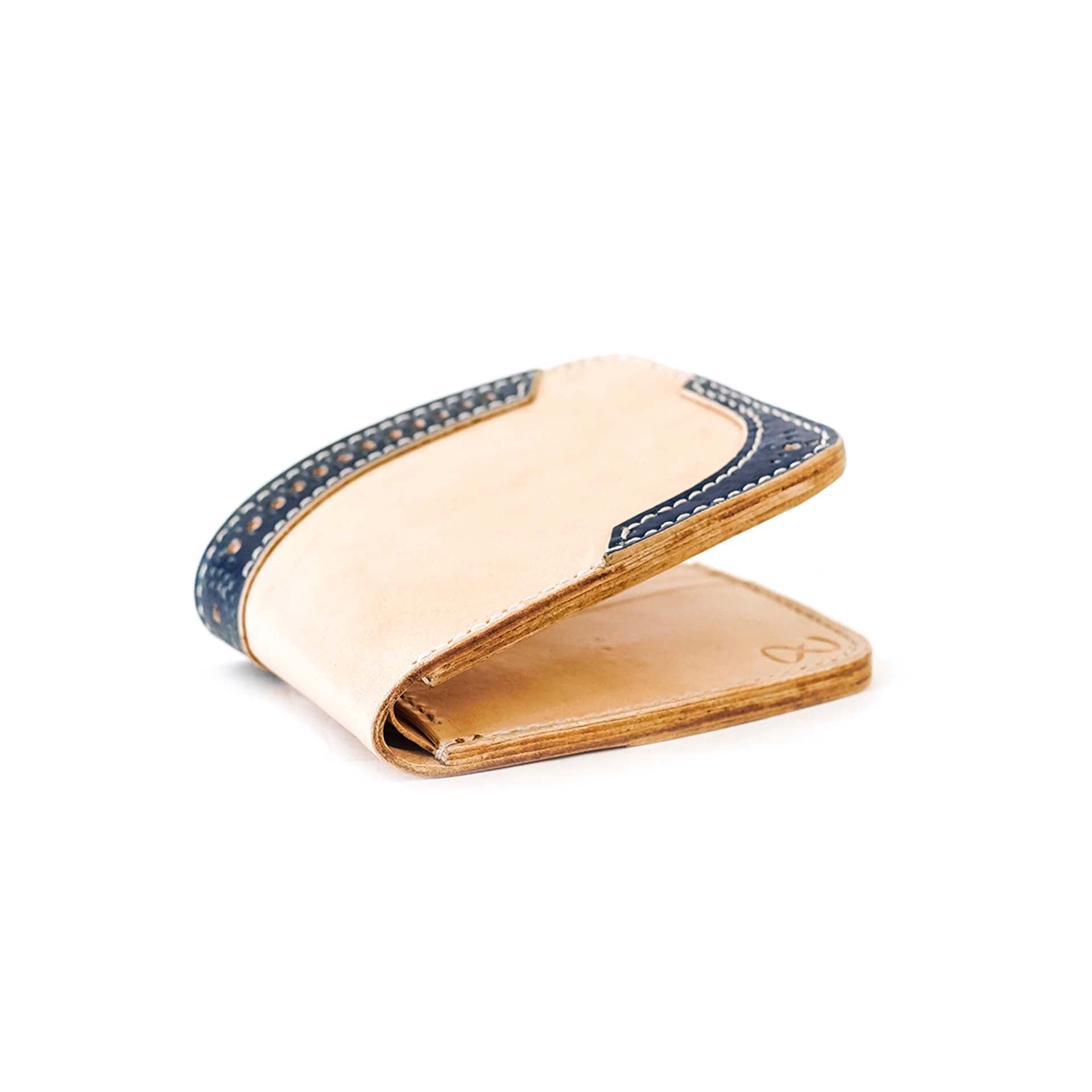 Les détails en cuir du motif richelieu ont été teints dans une teinte indigo intense. Le cuir se patinera avec le temps. Le bord est ensuite poli et ciré à la main, ce qui confère au portefeuille une finition impeccable.