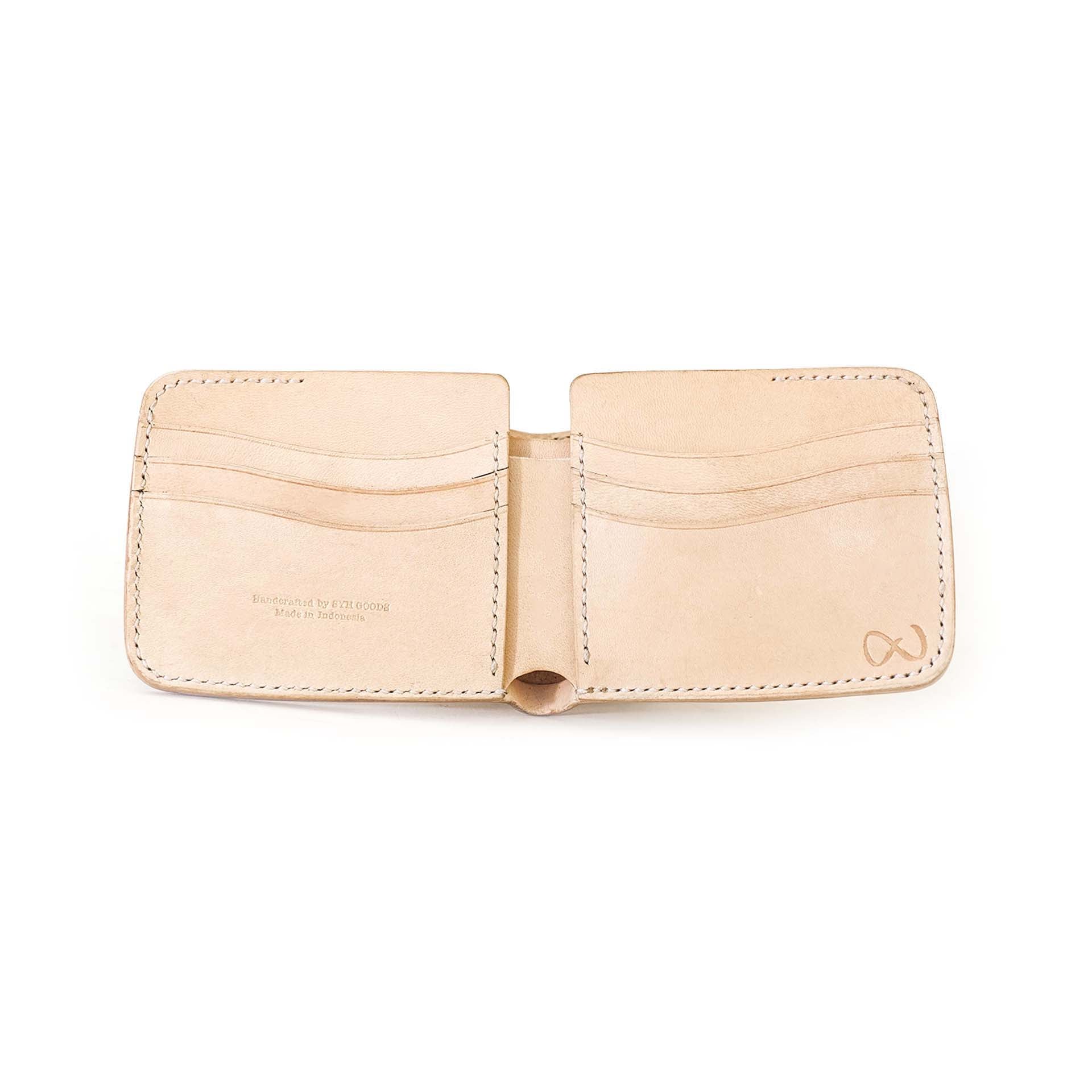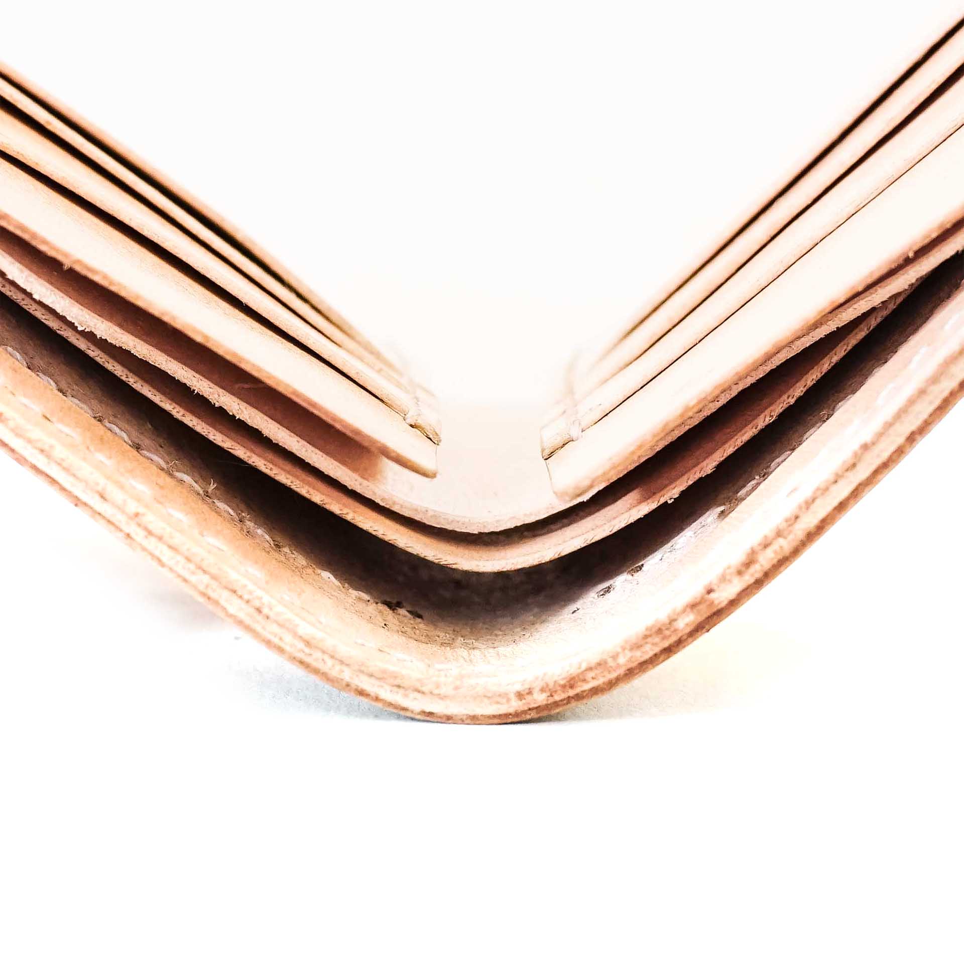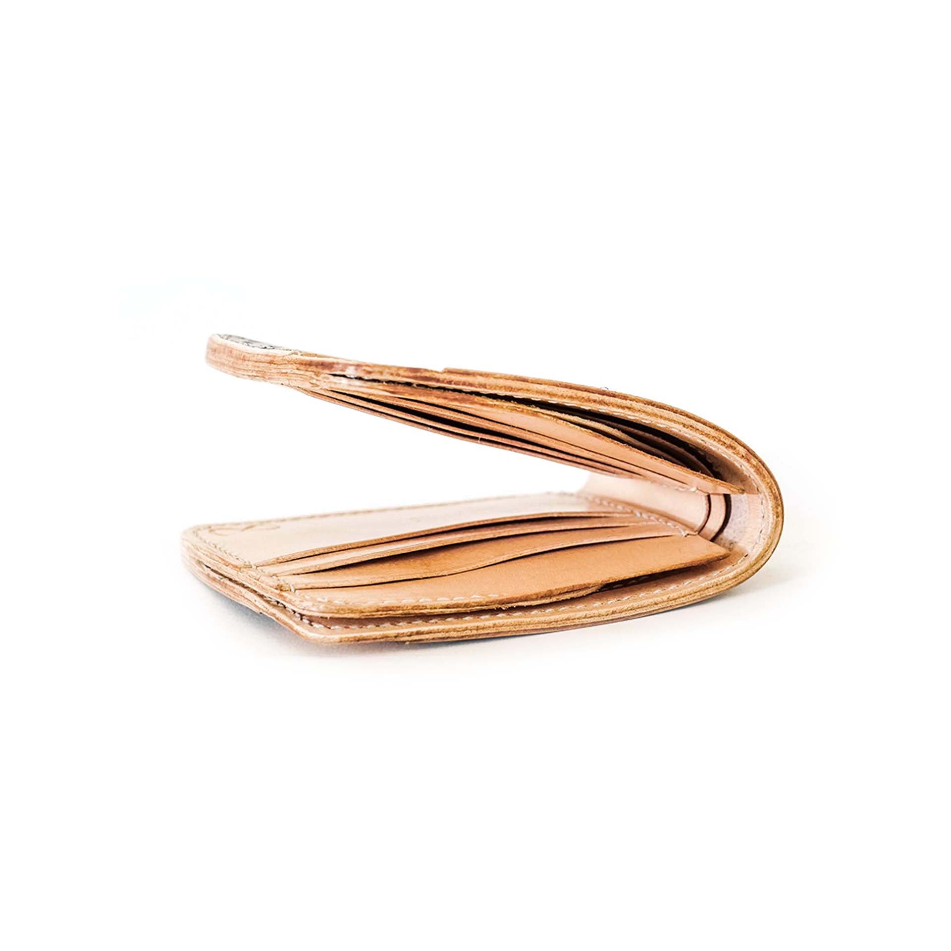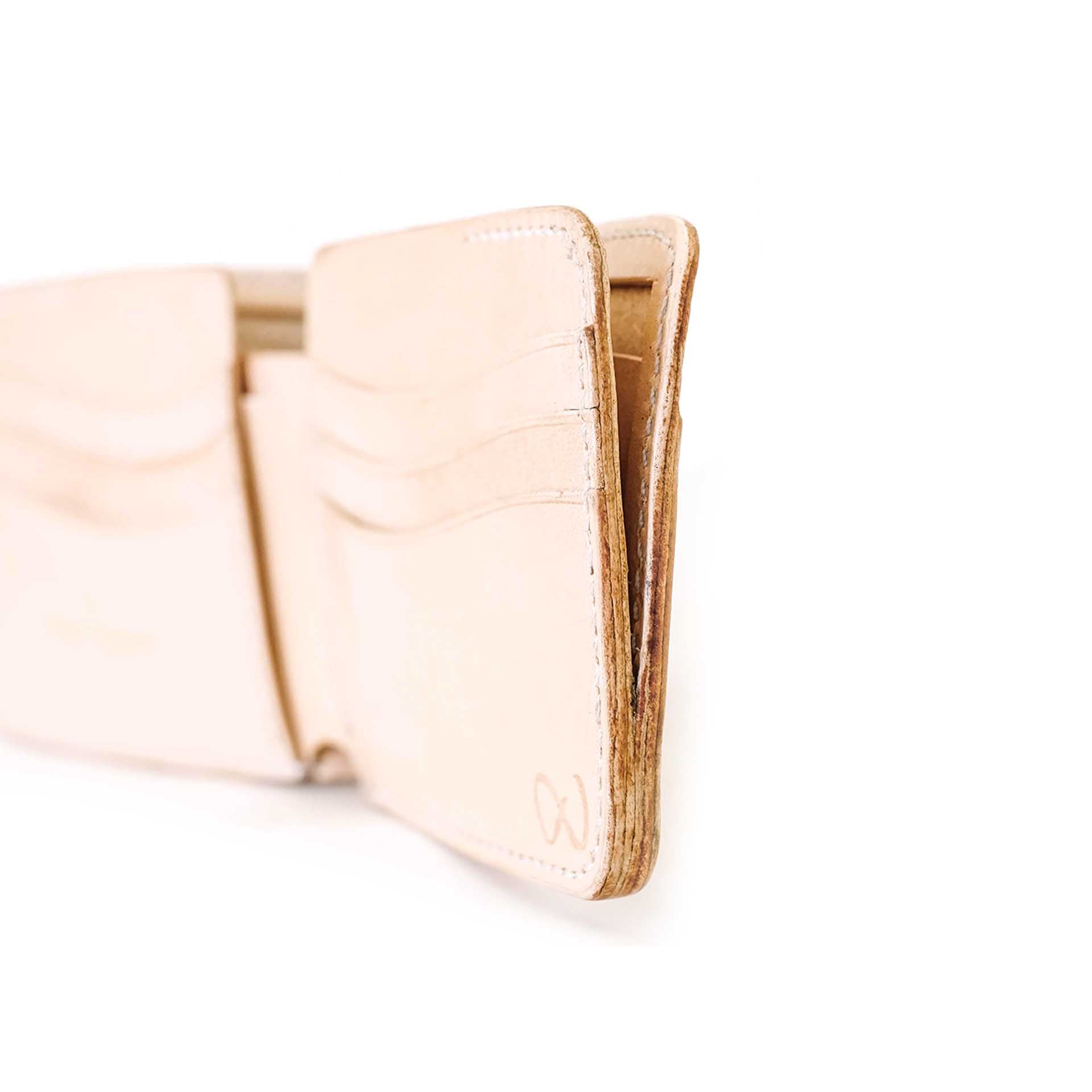Les détails en cuir du motif richelieu ont été teints dans une teinte indigo intense. Le cuir se patinera avec le temps. Le bord est ensuite poli et ciré à la main, ce qui confère au portefeuille une finition impeccable.