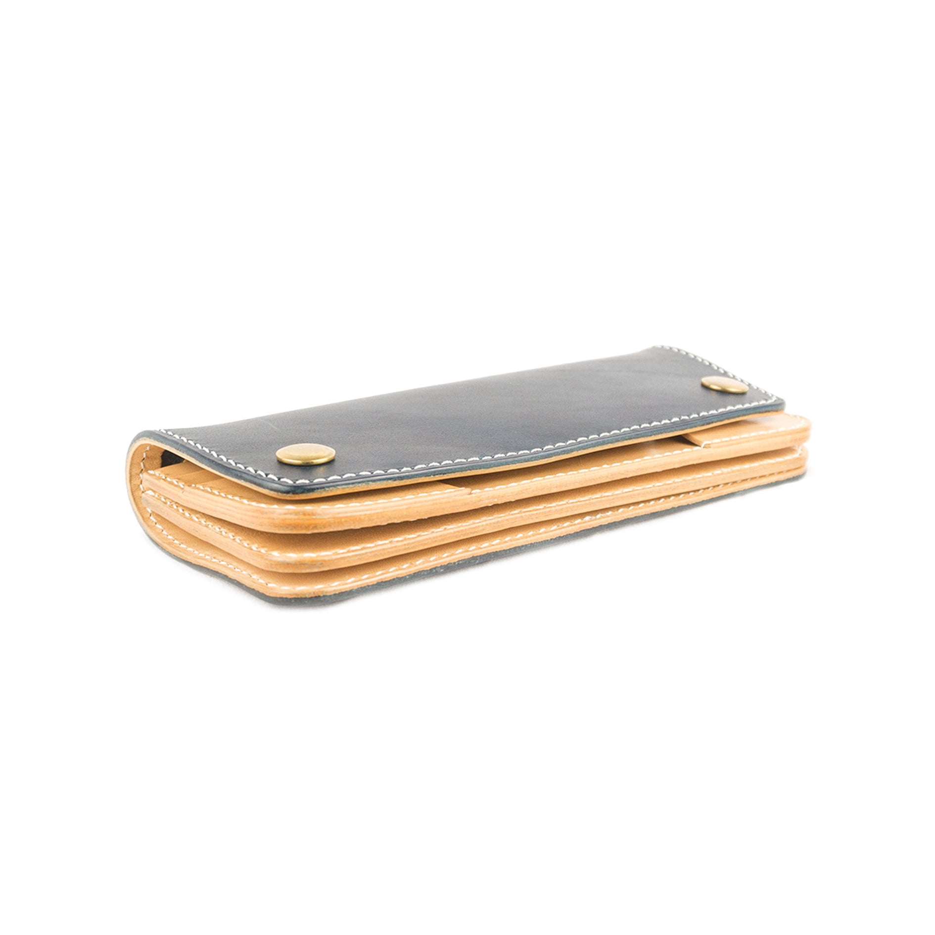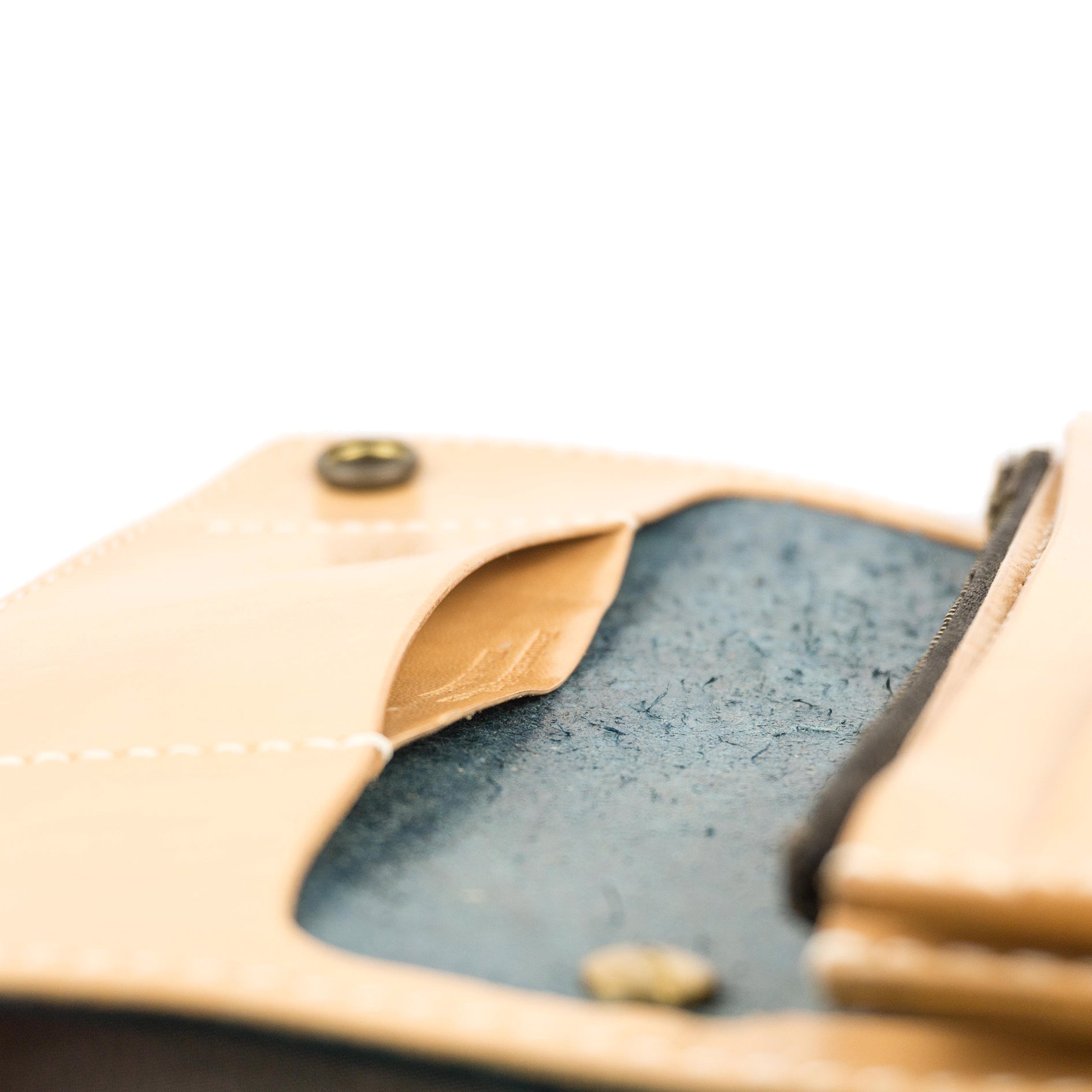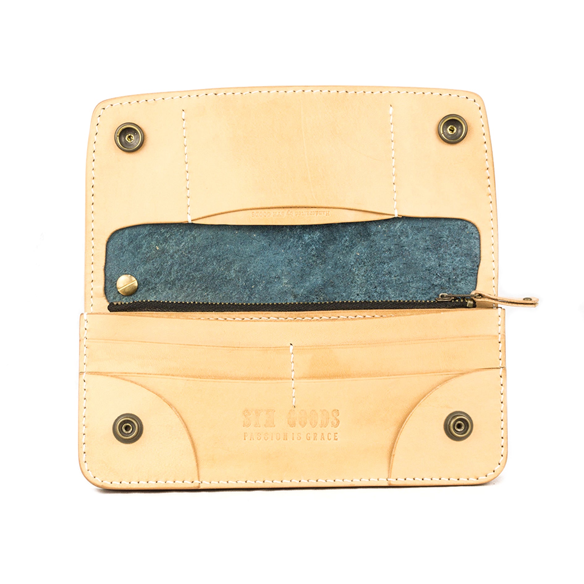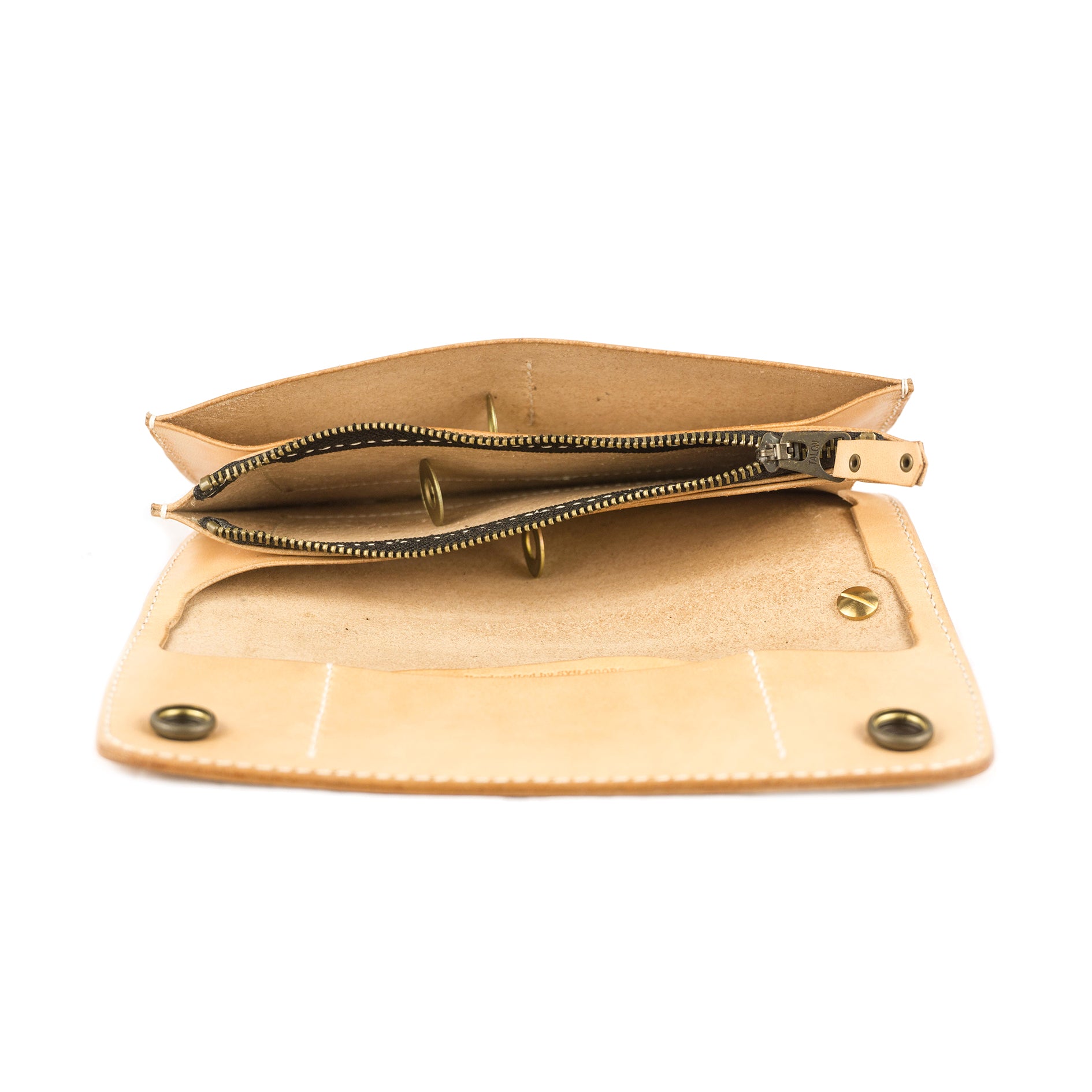 Inspired by the outlaws and bikers, Warusawa II wallet takes its design cues from traditional vintage trucker wallets, but is upgraded with details that only found in high end leather products. Well-made wallet made from Italian vegetable tanned leather from tannery Badalassi Carlo with Vachetta. Any brass hardware that is absolutely strong and corrosion resistant. The Zipper is from Talon Zipper.